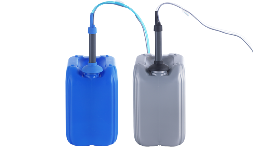 Winterhalter's suction technology ensures simple and safe handling during the use of liquid chemicals. Suction tubes are available in different lengths for canisters and barrels and have an empty indication. The colour code for detergent and rinse aid corresponds to the colour of the canister and prevents accidental mix-ups. A height-adjustable cap ensures a secure seal.