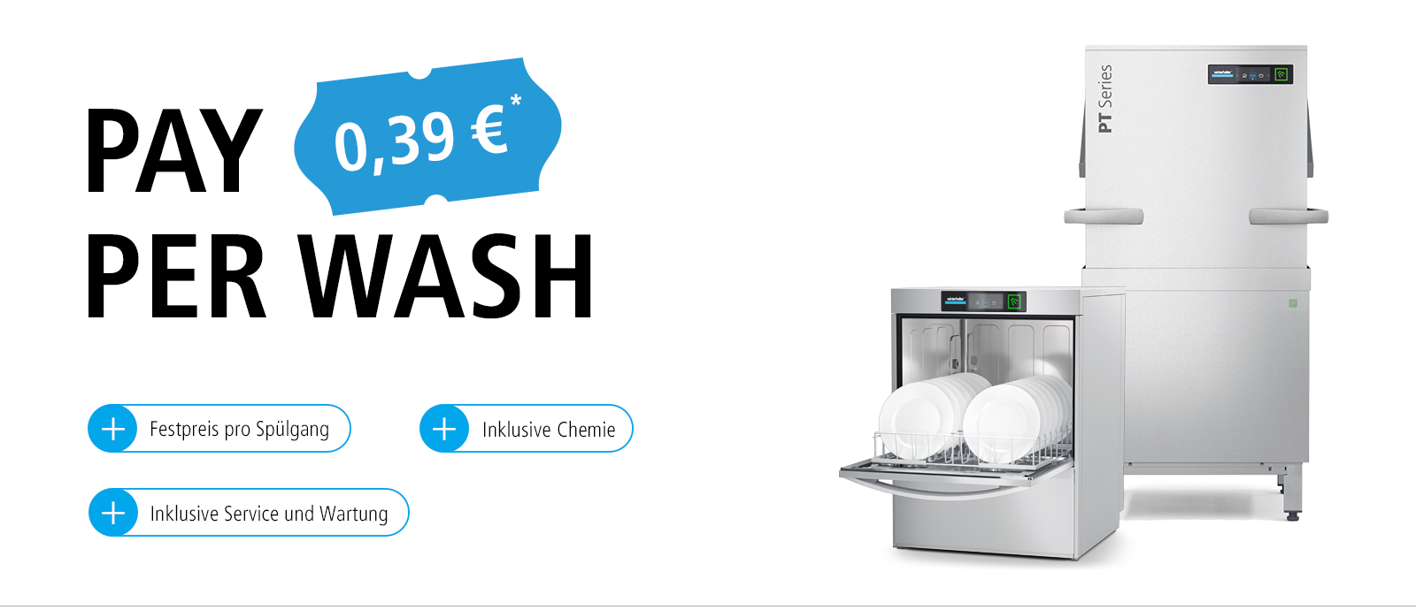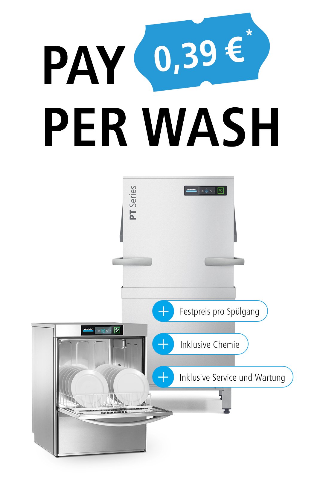 Machen Sie sich keine Gedanken über Ihr Budget: Bei PAY PER WASH bekommen Sie das komplette Winterhalter System ohne Invest. Sie zahlen lediglich den Spülgang.
