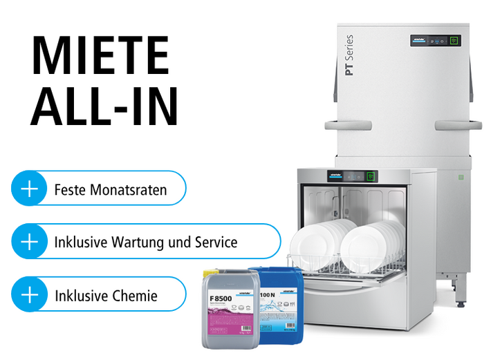 - Maschine, Wartung, Reparatur, Wasseraufbereitung und Spülchemie inklusive