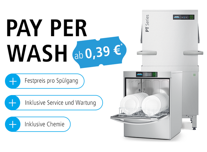 PAY PER WASH ist eine innovative Finanzierungslösung für das gewerblichen Spülen: Es ist das erste Modell, bei dem die Abrechnung nach tatsächlicher Nutzung erfolgt – mit einem festen Preis pro Spülgang. Das heißt: Sie bezahlen fürs Spülen nur dann, wenn die Maschine und damit auch Ihr Geschäft läuft.