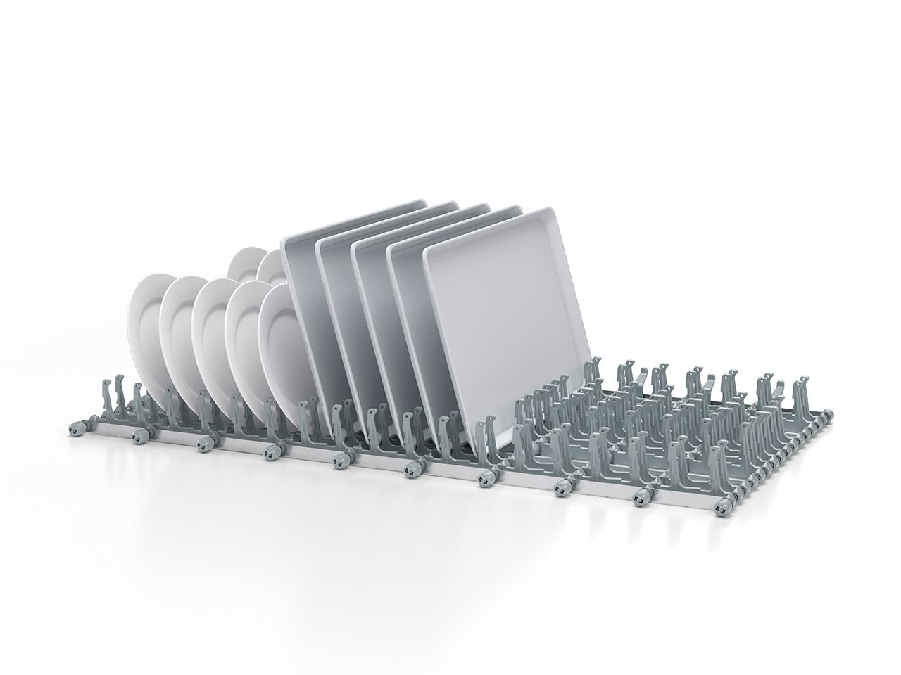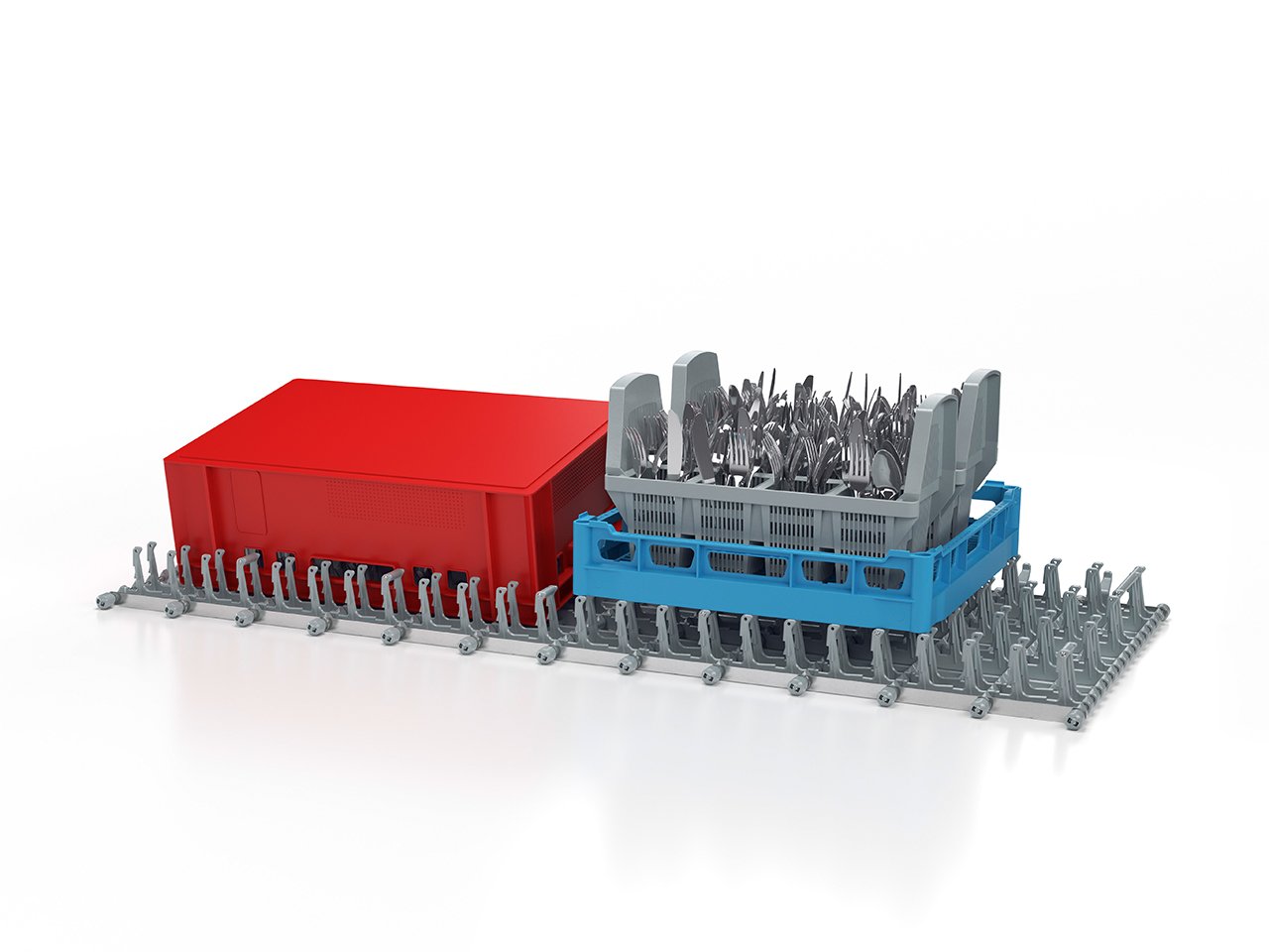 Comedores comunitarios, catering, gastronomía y hostelería: En cada operación existen distintos elementos de lavado en diferentes tamaños y cantidades. En la fase de planificación, la cinta transportadora se configura individualmente para ajustarse a los requisitos en cuestión. A ello se le añaden racks y accesorios para vasos y cubiertos.