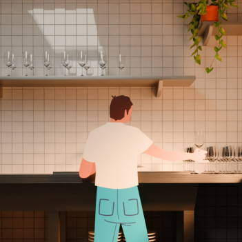 Camarero en un restaurante de Madrid: cuando el local cierra y sus compañeros ya están en casa, él se queda repasando una a una las copas para que la cristalería brille en el siguiente servicio.