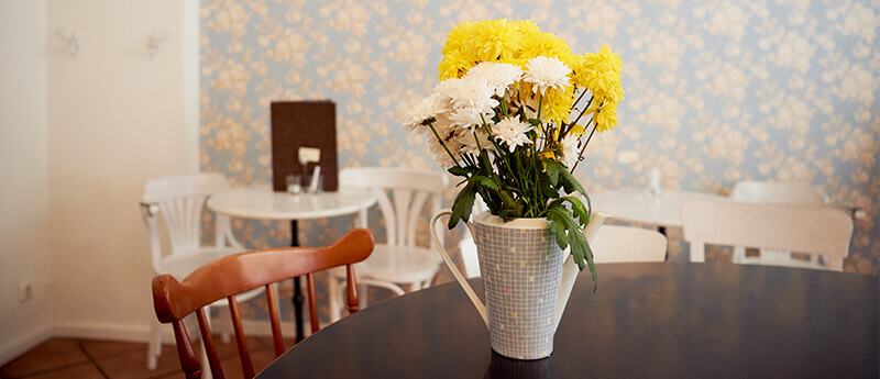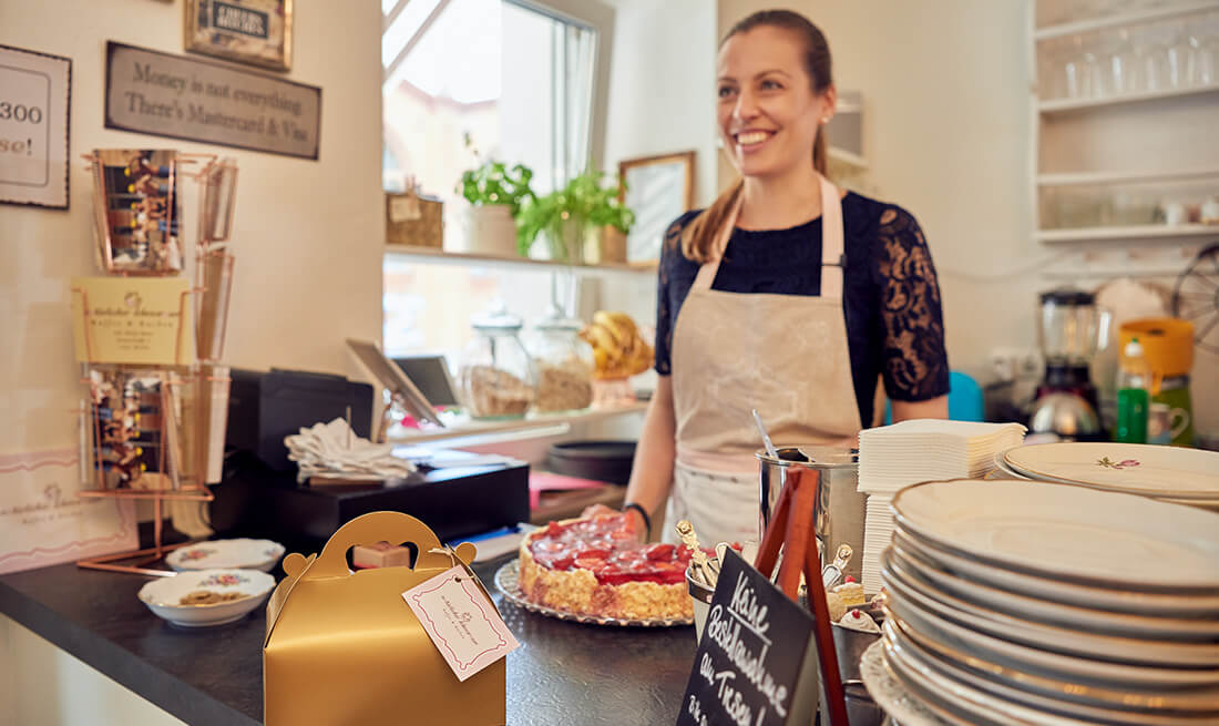 En la cafetería de Antje, las tartas se sirven en platos decorados con flores y de bordes dorados y el café se bebe con estilo en tazas a juego. Sobre los platos, pequeños tenedores dorados para dar un toque perfecto: y nada de eso debe cambiar. Para ella, una limpieza cuidadosa de los juegos de café especiales es fundamental, y es que todo debe conservarse el mayor tiempo posible. Por este motivo, Antje Menz se decantó por un lavavajillas de carga frontal de la serie UC con función "Energy". Los detergentes adecuados limpian delicadamente el material de lavado y el lavavajillas ofrece un consumo energético significativamente menor. La recuperación de calor del aire circulante integrado "Energy" aprovecha la energía del vapor de agua caliente para precalentar el agua de entrada fría. Esto reduce los costes operativos y hace que, al abrir la máquina, prácticamente no se libere vapor de agua caliente y húmedo. Esto es todo una ventaja, especialmente en la pequeña sala.