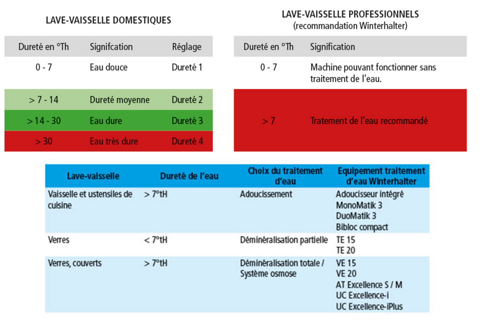 Lorsque l’eau est dure, la présence de sels et de minéraux réduit l’efficacité des produits de lavage et de rinçage. De plus, ils ont tendance à se déposer sur la vaisselle et sur les surfaces de la machine.