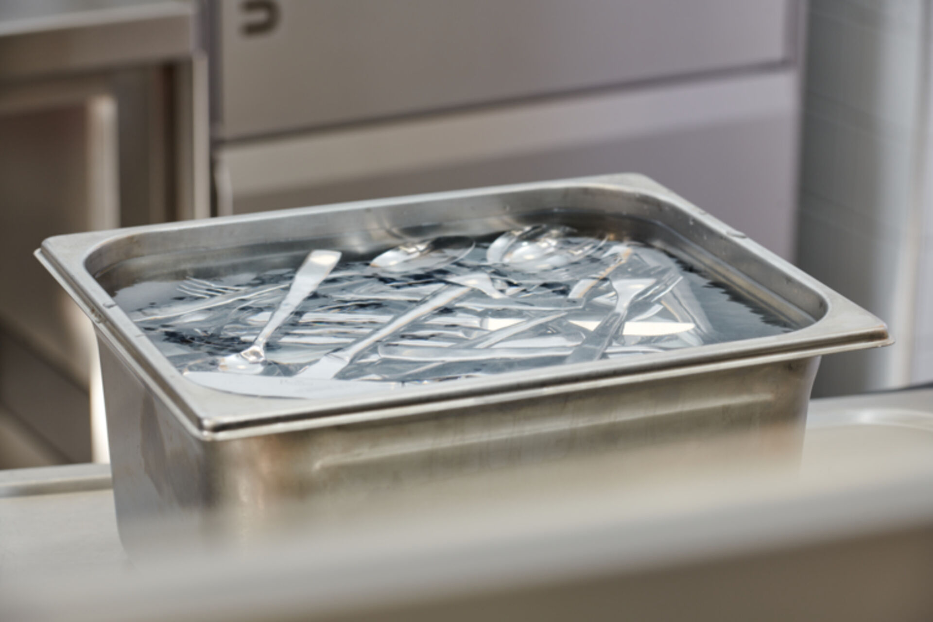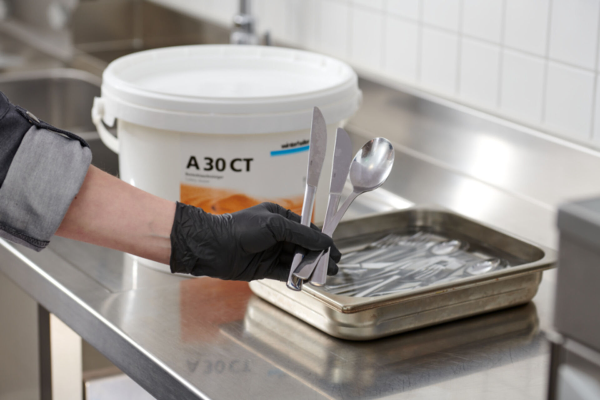 Na verloop van tijd kan roestvrijstalen bestek zijn glans verliezen. Een basisreiniging met een dompelbad in heet water en een speciaal inweekmiddel zoals A 30 CT helpt om de oorspronkelijke glans te herstellen.